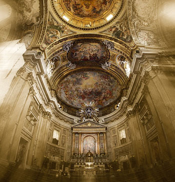 Quest’arte volutamente produce bellezza, ma non una bellezza ordinaria, discreta, capace cioè d’imporsi per la sua intrinseca natura, per la sua capacità di rivelarsi nell’ordinario, no, un altro tipo di bellezza, una bellezza che possiamo anche indicare con la definizione bellezza stupefacente. Ovvero una bellezza che deve avere la forza di stupire, di far sgranare gli occhi all’osservatore; il quale può sentirsi anche inizialmente infastidito da una certa esplosione di forme, ma che poi avverte se stesso trasportato in una dimensione superiore, in una dimensione di sublimazione. Tutto questo è funzionale ad esprimere la specificità della Liturgia cattolica, specificità che era stata attaccata dal luteranesimo con la negazione della transustanziazione e poi dai seguaci di Lutero addirittura con la negazione della Presenza reale di Cristo in Corpo, Sangue e Divinità nell’Eucaristia. L’arte barocca nelle chiese vuol esprimere questo concetto: il marmo si gonfia, le forme arrivano a contorsioni straordinarie perché è altrettanto straordinario ciò che sta avvenendo: le leggi dello spazio e del tempo si annullano nel Sacrificio Eucaristico, si ri-attualizza il Sacrificio del Venerdì Santo, i fedeli vengono veramente trasportati sul Calvario e il pane e il vino si trasformano veramente e unicamente nel Corpo e nel Sangue del Redentore.